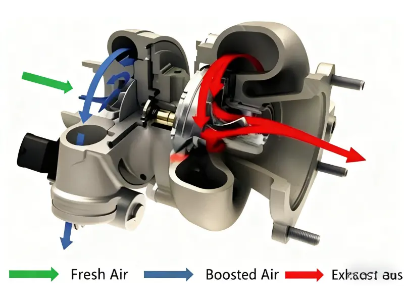 Un turbocompresor tiene dos partes principales: la turbina y el compresor.